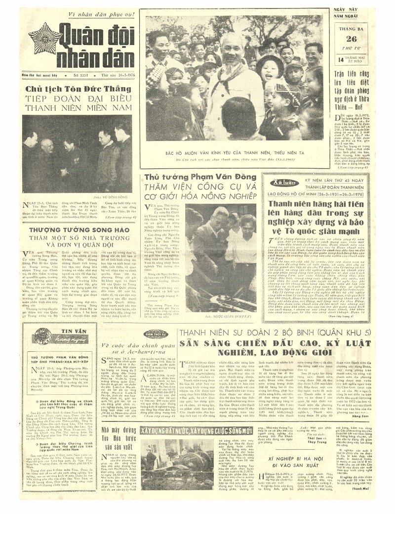 Từ tháng 12 năm 1976 đến nay: Đoàn Thanh niên Cộng sản Hồ Chí MinhĐoàn Thanh niên Cộng sản Hồ Chí Minh - đội quân xung kích cách mạng, đội dự bị tin cậy của Đảng. Ảnh: Tuoitrethudo.vnPhát huy truyền thống vẻ vang trong 91 năm qua, các cấp Đoàn và tuổi trẻ cả nước giữ vững niềm tin sắt son với Đảng, Nhà nước và Nhân dân ta, biến những khó khăn, thách thức thành động lực, kiên trì, kiên định thực hiện vị trí, chức năng, vai trò của mình trong hệ thống chính trị; phát huy tinh thần đại đoàn kết dân tộc và đoàn kết quốc tế; khơi dậy khát vọng dựng xây dựng đất nước phồn vinh, hạnh phúc trong các tầng lớp thanh thiếu niên và nhi đồng. Luôn tiên phong đi đầu, phát huy truyền thống cách mạng vẻ vang, xung kích, sáng tạo trong sự nghiệp xây dựng và bảo vệ Tổ quốc Việt Nam xã hội chủ nghĩa, góp phần thực hiện thành công Nghị quyết Đại hội đại biểu toàn quốc lần thứ XIII của Đảng.Mảnh máy bay lấy từ xác máy bay Mỹ bị bắn rơi tại núi Nài vào ngày 26-3-1965. Ảnh tư liệuNgày 26-3-1965: Bộ đội pháo cao xạ đã bắn rơi 12 chiếc máy bay Mỹ tại tỉnh Hà Tĩnh. Đây là một trận thắng oanh liệt của binh chủng pháo cao xạ trong cuộc chiến đấu đánh trả chiến tranh phá hoại của đế quốc Mỹ đối với miền Bắc nước ta.